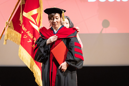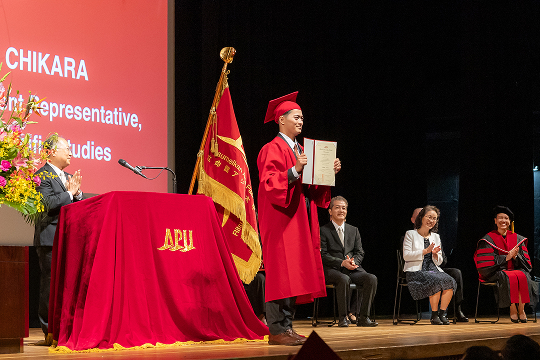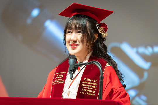 A congratulatory message from Morse Caoagas Flores (College of Asia Pacific Studies, Class of 2006, representative of the Alumni Association, Office of the United Nations High Commissioner for Human Rights, Philippine) was delivered and warmly read on his behalf by Weineza Celine(College of Asia Pacific Studies, Class of 2022, Rwanda).