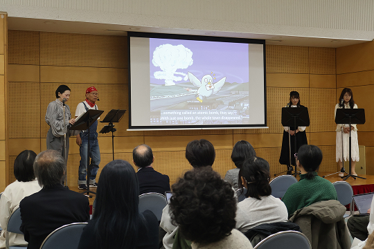 Beginning with President Yoneyama’s opening speech, across the two days, the participatory research and education program featured several creative engagements with war memory: an exhibition of war-themed paintings created by high school students based on the testimonies of survivors, a kamishibai (paper theater) performance on the theme of Hiroshima’s postwar reconstruction accompanied by a talk from its creators, and a session titled “War Memories and Narratives Across Generations: Considering Hiroshima Through Ōkunoshima.” In this session, a tour guide from Ōkunoshima was invited to engage participants in discussions about various issues related to remembering the war.