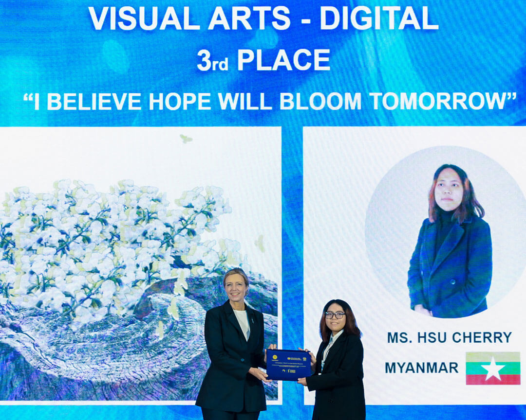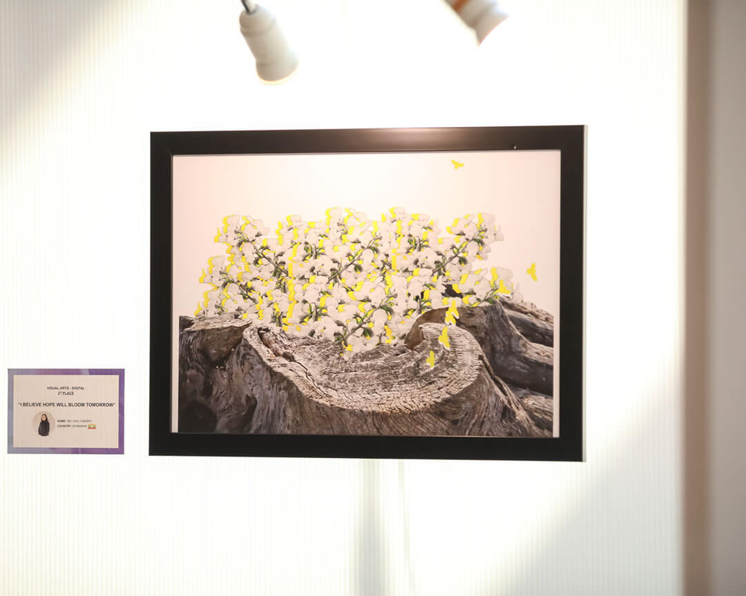 For her artwork, Ms. HSU combined a photograph of an old tree trunk taken at Ozu Castle in Japan with imagery of Padauk flowers—the national flower of Myanmar—and birds. She selected yellow as the main color, noting that it symbolizes happiness in many cultures and is also the natural color of the Padauk. In her piece, yellow represents hope and renewal. The judges praised her work for its symbolic expression of peace and coexistence through the thoughtful integration of natural elements.