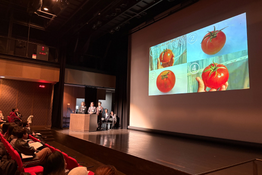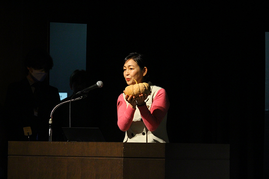 The first presentation was given by Visiting Professor Naomi Zaizen, who reported on cultivation projects involving local plant varieties such as the Sourin Kabocha (a traditional Oita pumpkin) and Shiro-nasu (a rare variety of white eggplant native to Oita). Having succeeded in harvesting these crops—despite their reputation for being difficult to grow—Prof. Zaizen introduced the harvested Sourin Kabocha, which drew applause and excitement from the audience.